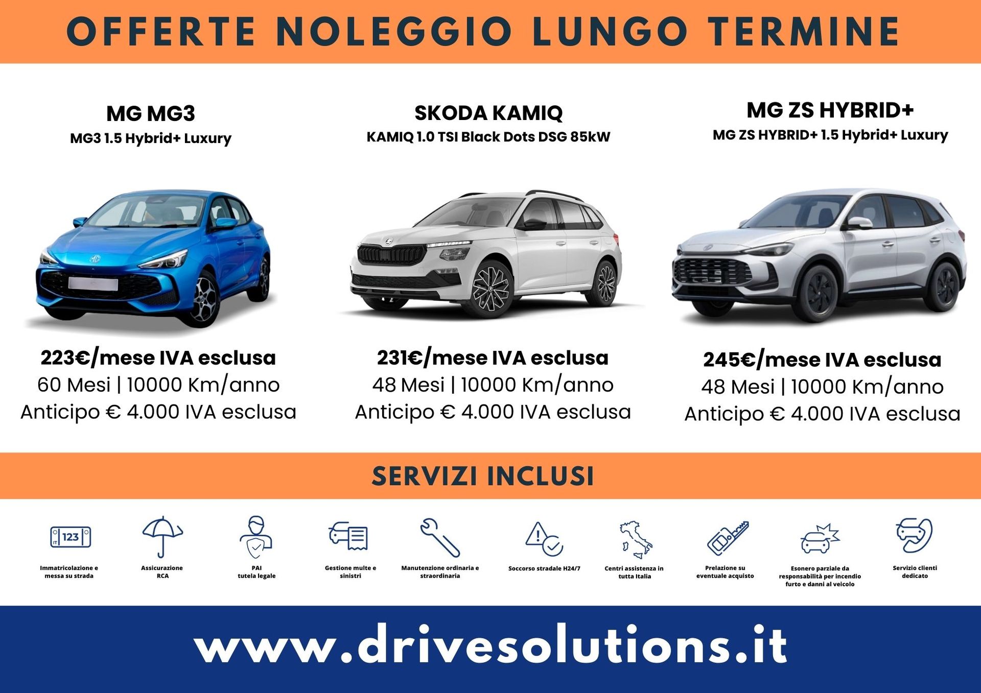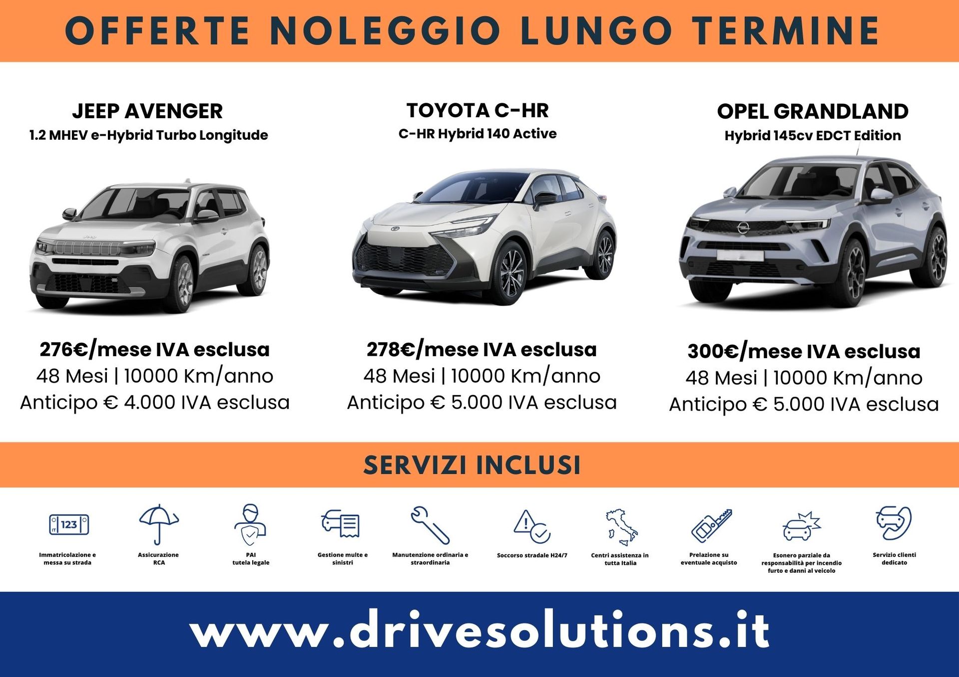 Ti offriamo anche una vasta serie di servizi di noleggio operativo, che ti consentono di accedere a numerosi vantaggi rispetto al sistema di acquisto tradizionale. Inoltre, affidandoti ai nostri professionisti, potrai ricevere consulenze mirate che ti aiuteranno a trovare il modello di veicolo e la forma di noleggio più adatta a te. Vieni a trovarci o contattaci per un preventivo: te lo forniamo in maniera gratuita e senza alcun impegno da parte tua.